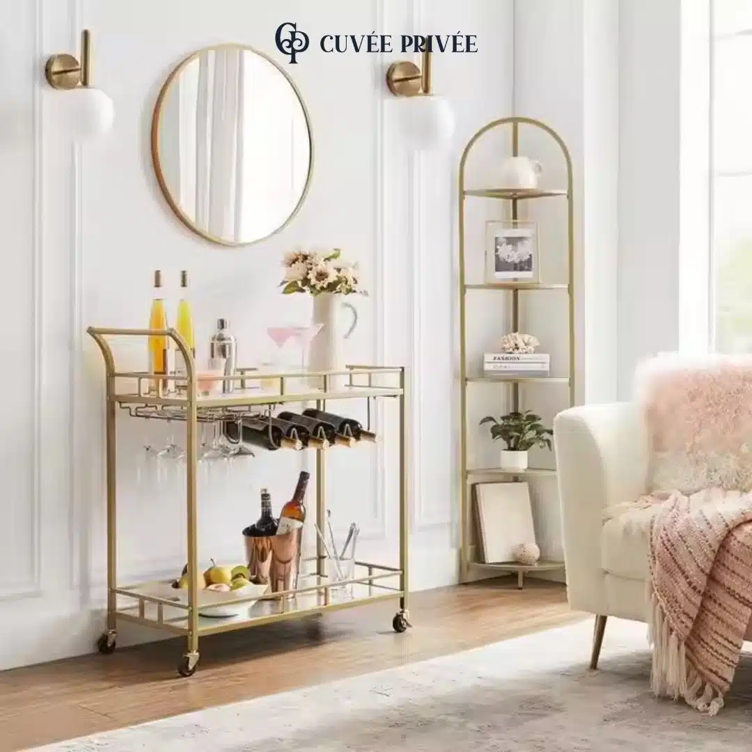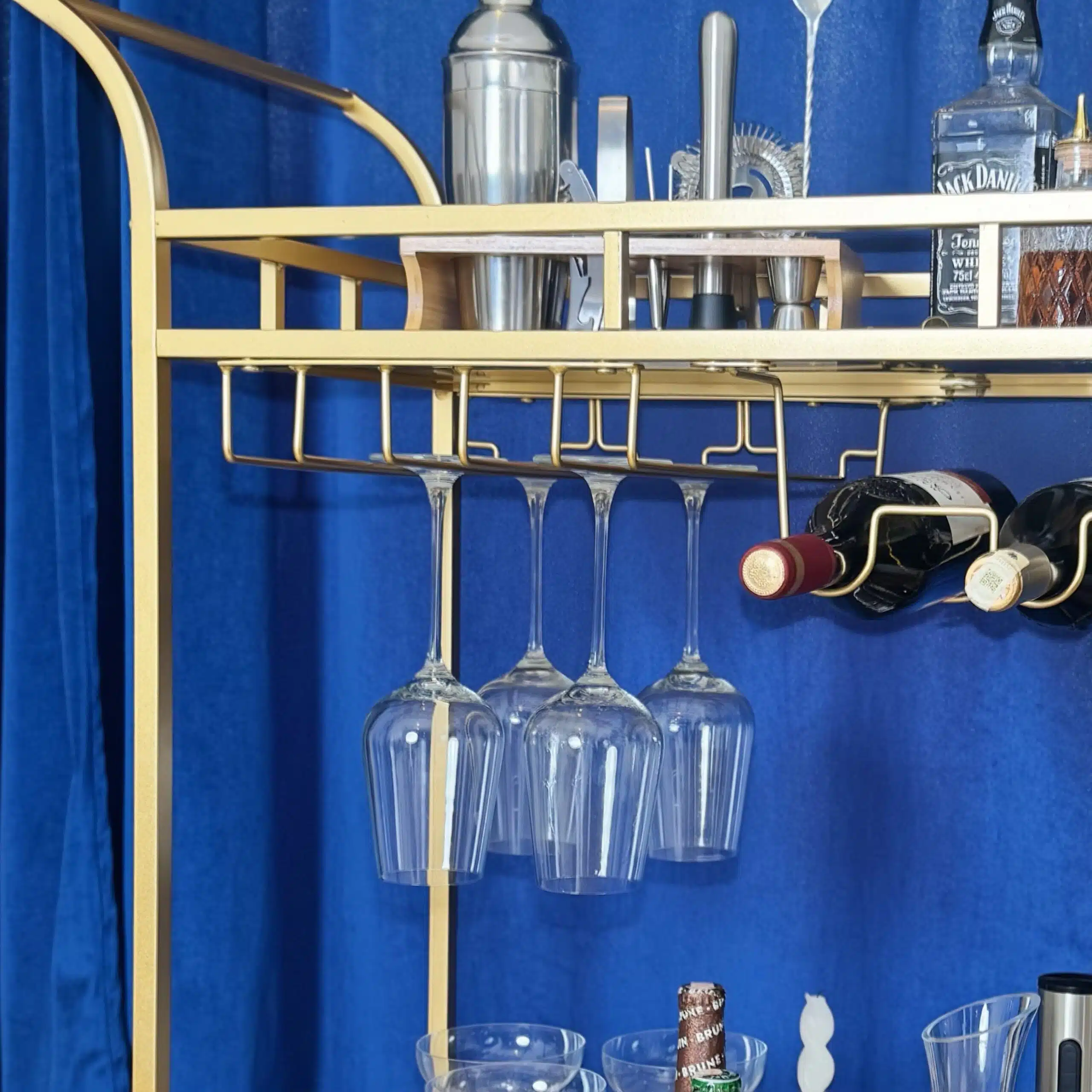 Sa structure en métal doré associée à des plateaux en verre crée un équilibre parfait entre robustesse et légèreté visuelle. Les porte-verres suspendus libèrent l’espace, tandis que le porte-bouteilles intégré maintient vos vins et spiritueux à portée de main.