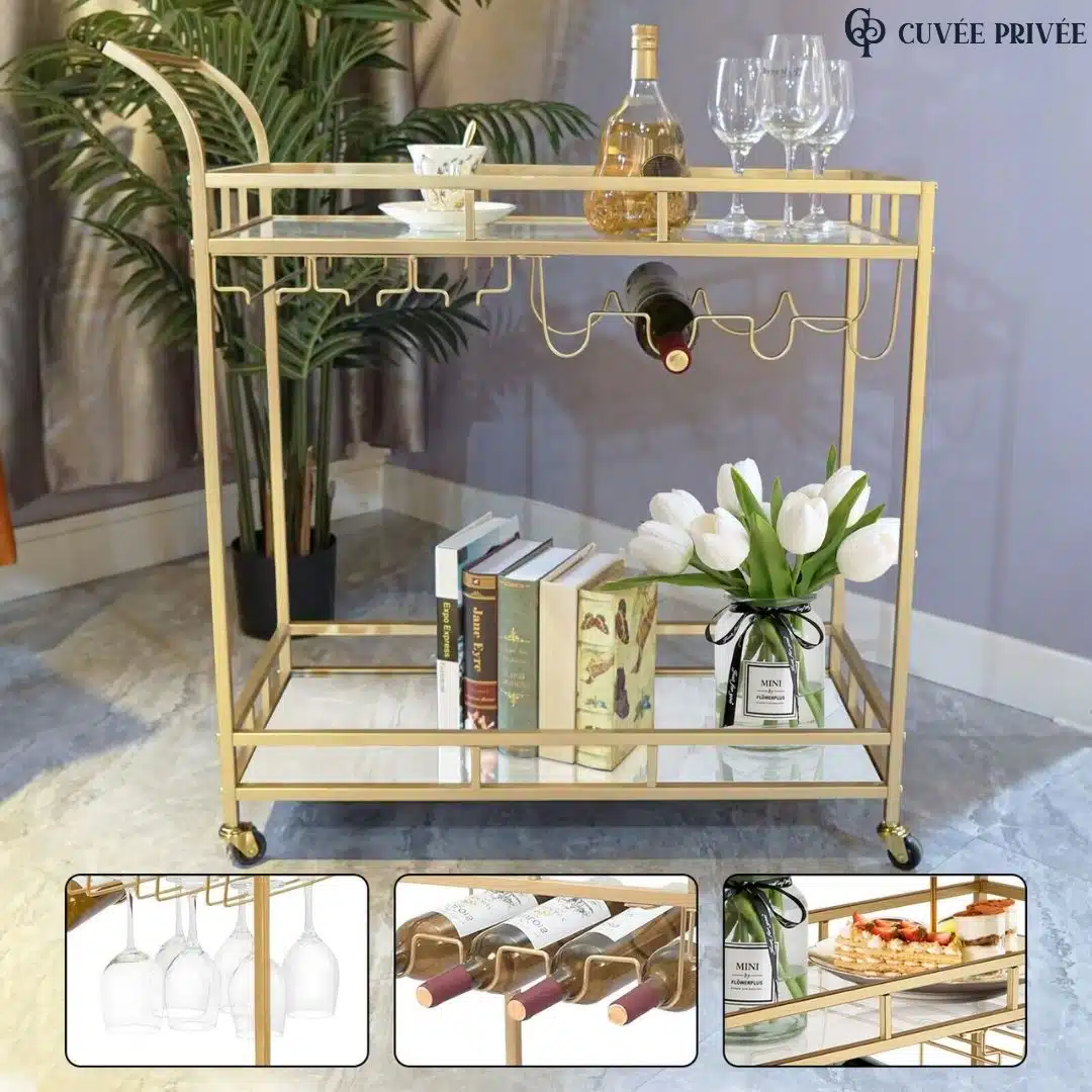 Chariot Bar Doré avec Porte-Bouteilles & Porte-Verres