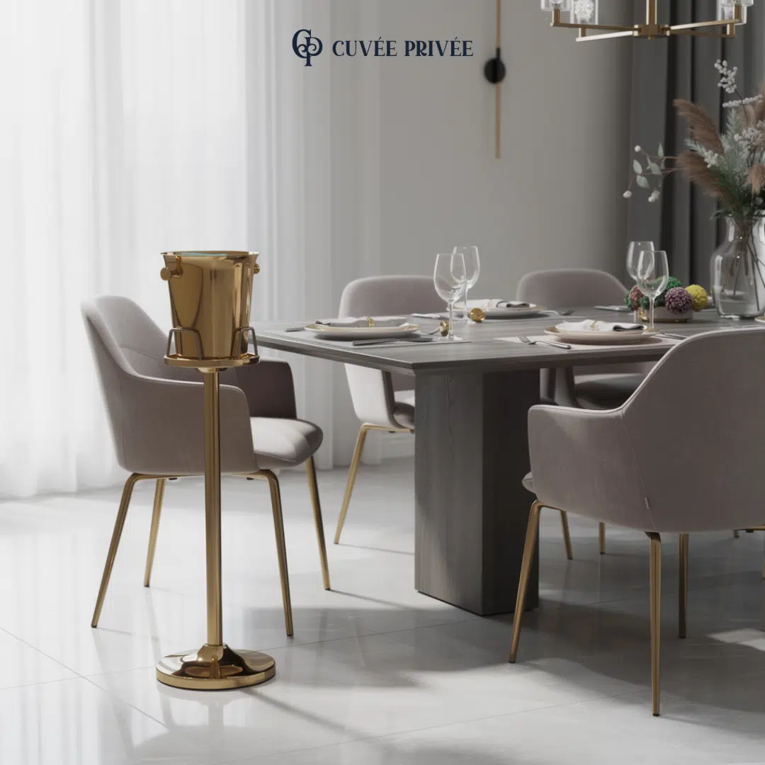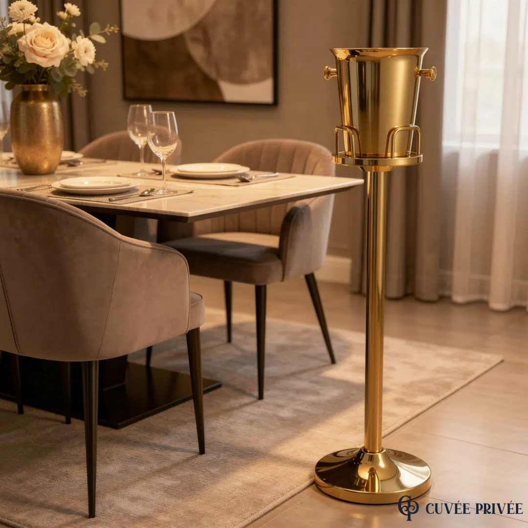 Pensé pour les moments d’exception, ce seau à glace sur pied doré  en acier inoxydable transforme instantanément votre espace en véritable scène de réception. Il permet de présenter champagne, vins ou boissons fraîches avec une élégance digne des hôtels et restaurants haut de gamme.