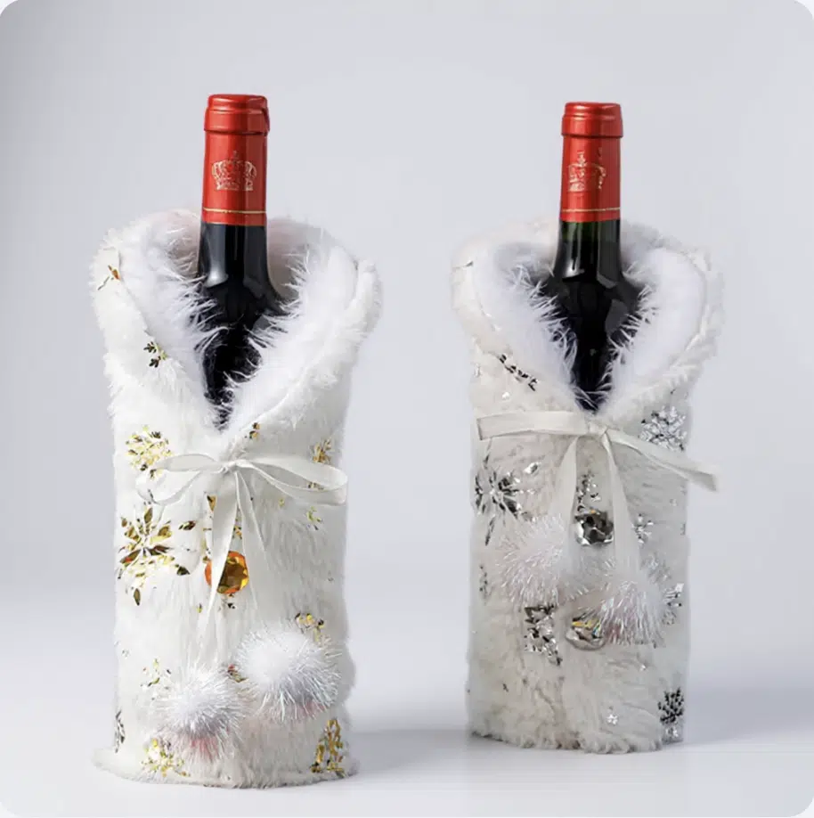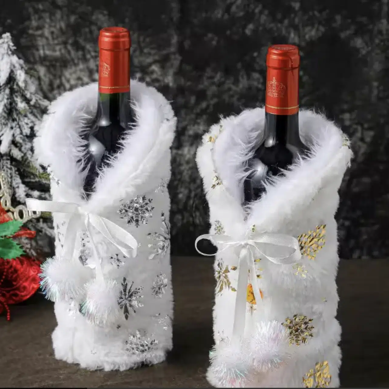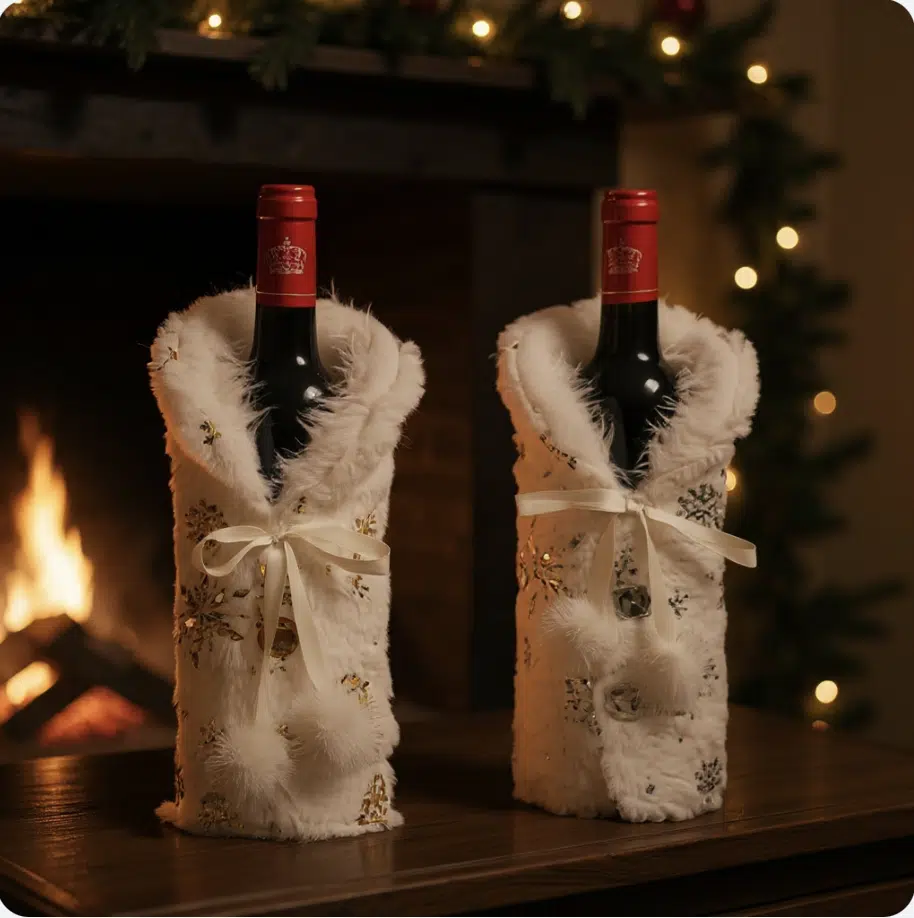 Ce set de deux habillages de bouteilles apporte l’esprit des fêtes directement à votre table. Conçus comme de véritables petits cols décoratifs, ils enveloppent élégamment vos bouteilles de vin ou de champagne pour leur donner une allure chaleureuse, raffinée et parfaitement dans le thème de Noël.